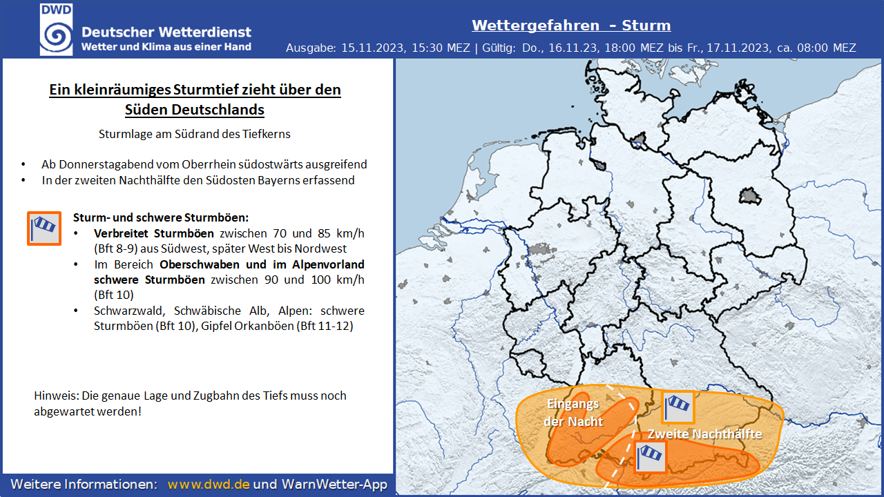 Dieser sorgt in der Nacht zum Freitag vor allem in der Südhälfte für ordentlich Rabatz. Gebietsweise regnet es kräftig und der Wind lebt deutlich auf. Südlich einer Linie Saarland-Bayerischer Wald drohen Sturmböen zwischen 70 und 85 km/h (Bft 8-9) zunächst aus Südwest, später aus West bis Nordwest bis ins Flachland. Im Alpenvorland, in Oberschwaben und generell in höheren Lagen sind schwere Sturmböen bis 100 km/h (Bft 10) denkbar. Orkanböen (Bft 12) drohen in den Gipfellagen.