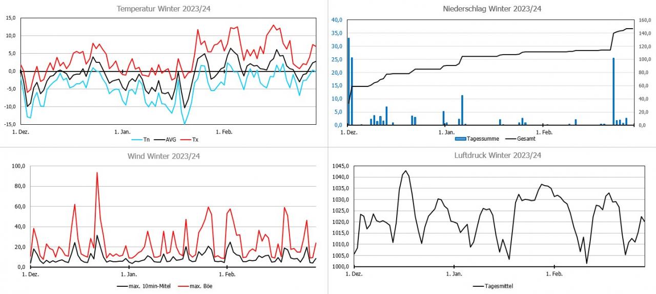 Der Winter war deutlich zu mild und normal nass. Während der Dezember und Januar normal zu milde Monate waren ohne extreme Abweichungen, wurde der Februar rekordmild. Auf den Februar gehe ich an der stelle nicht ein, dazu habe ich in der Monatsübersicht was geschrieben. Vor allem der Dezember ist relativ nass und tiefdruckgeprägt gewesen mit einer Neuschneesumme von 68cm und 90mm Niederschlag.