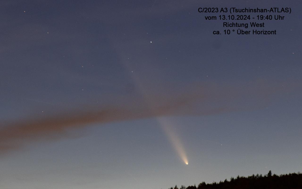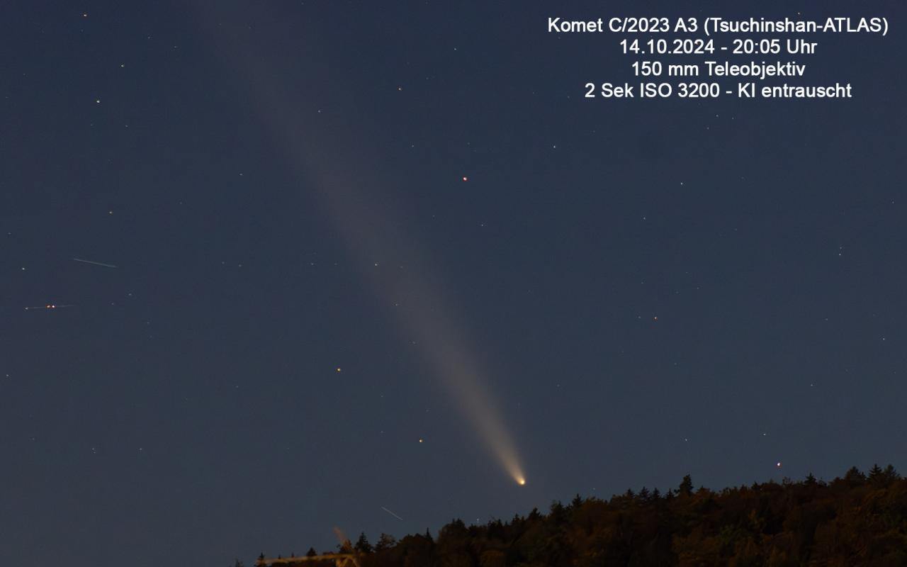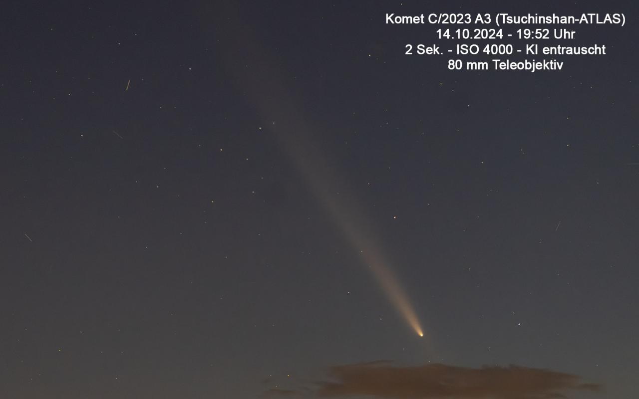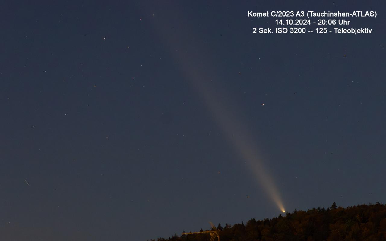Dieser Komet wurde bereits am Anfang des Jahres entdeckt, wird wohl Ende September (Morgenhimmel) dann ab dem 15. Oktober 2024 am Abendhimmel ein beeindruckendes Schauspiel liefern, wobei dieser auch sehr gut mit dem bloßem Auge dann sichtbar sein wird, Voraussetzung ist, dass kein Regen oder es bewölkt ist. Aber bis zu diesem Zeitpunkt ist es noch lange. Mehr Infos dann ab nächster Woche wenn ich mehr Zeit dazu habe.