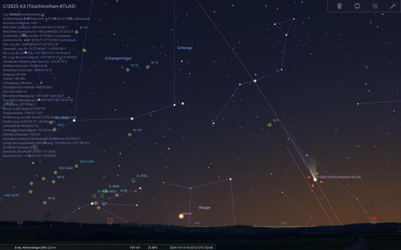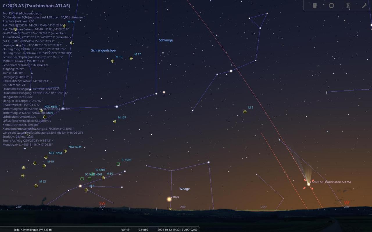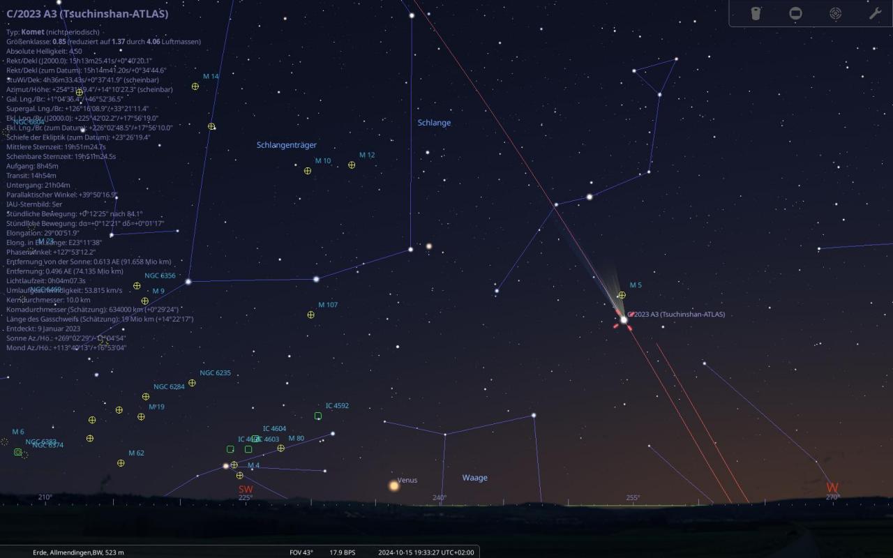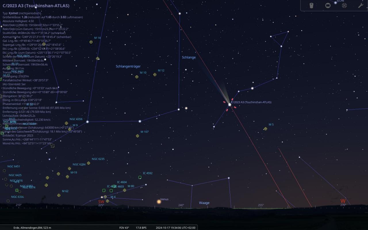 Dieser Komet wurde bereits am Anfang des Jahres entdeckt, wird wohl Ende September (Morgenhimmel) dann ab dem 15. Oktober 2024 am Abendhimmel ein beeindruckendes Schauspiel liefern, wobei dieser auch sehr gut mit dem bloßem Auge dann sichtbar sein wird, Voraussetzung ist, dass kein Regen oder es bewölkt ist. Aber bis zu diesem Zeitpunkt ist es noch lange. Mehr Infos dann ab nächster Woche wenn ich mehr Zeit dazu habe.