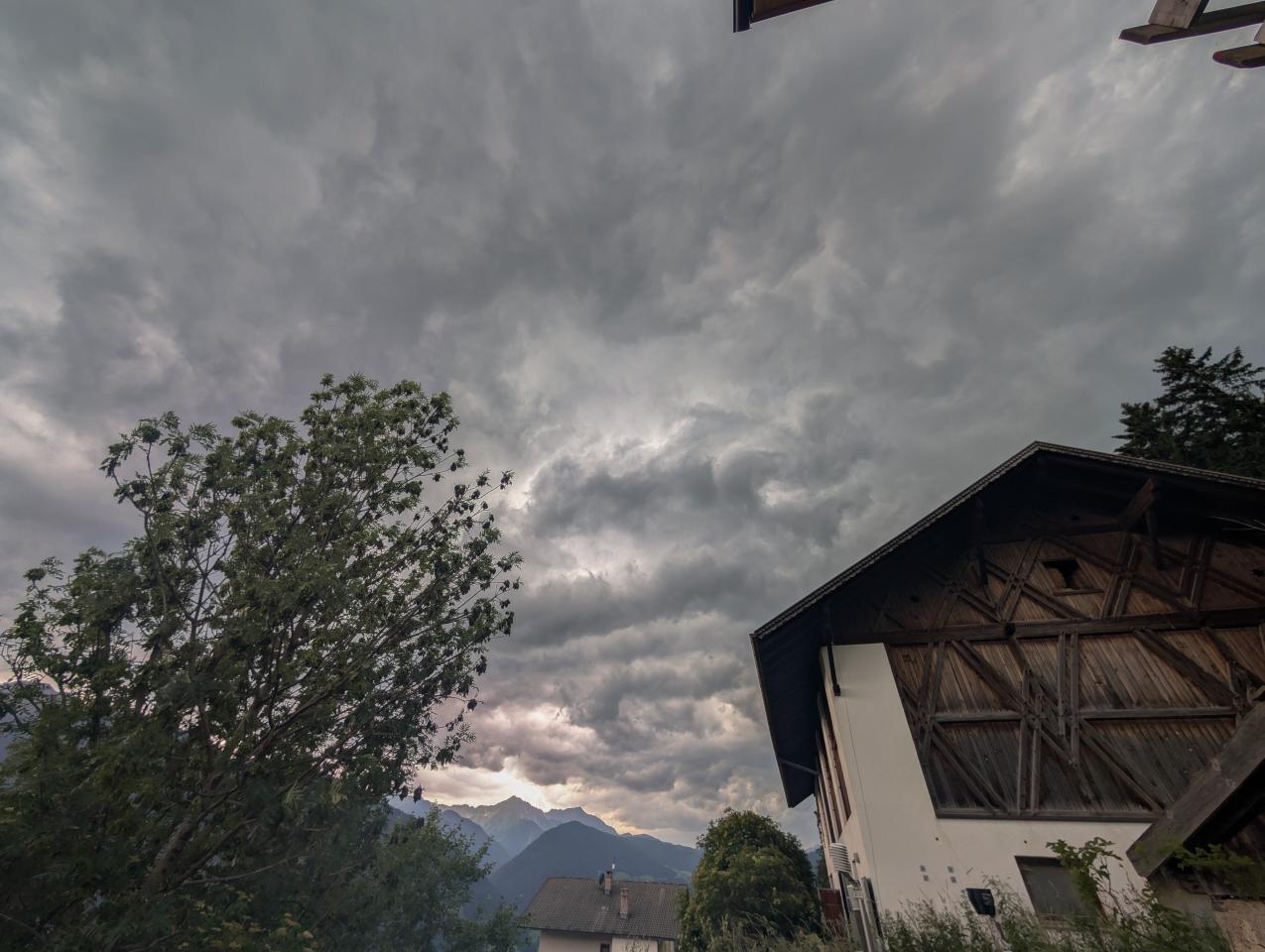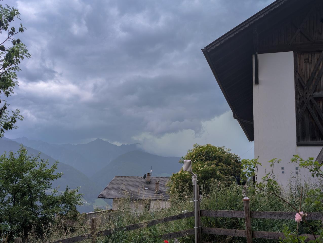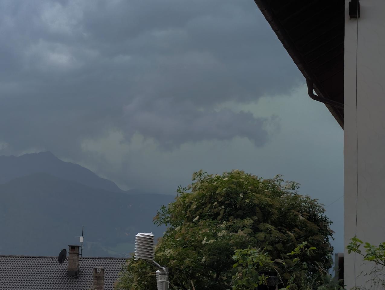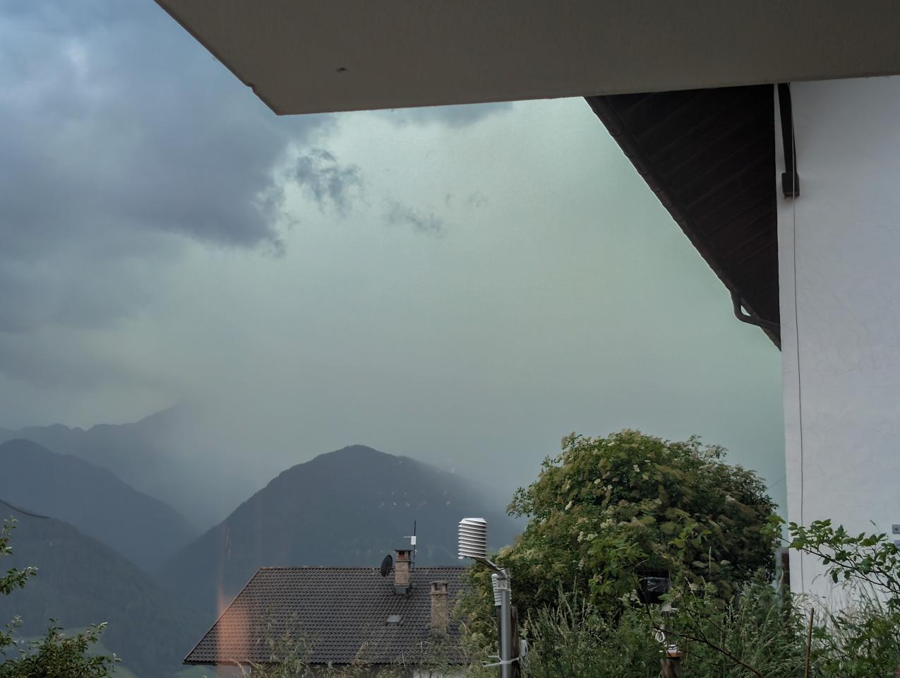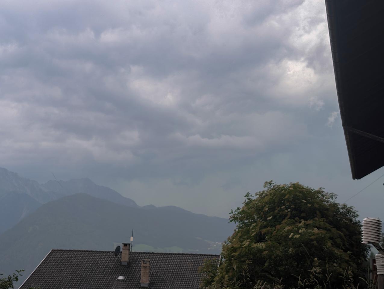 Als die zwei Starkgewitter (mindestens eine die den Outflow verursacht hat war relativ sicher eine Superzelle) sich zusammengeschlossen hatten und übers Wipptal bretterten konnte ich auch diese Graugrüne Wand gut festhalten. Ich habe die Belichtung etwas runtergeschraubt, da es zu dem Zeitpunkt recht dunkel war (man sieht im einem der letzten Bilder sogar die Spiegelung im Fenster da wir innen Licht anmachen mussten) und das Handy die Belichtung so hochgestellt hat, das es aussah wie am helllichten Tage. So kam die Grüne Färbung auch nicht so gut zur Geltung. So wie es jetzt aussieht sah es auch in echt aus, also da ist nichts über die Realität geschönt!