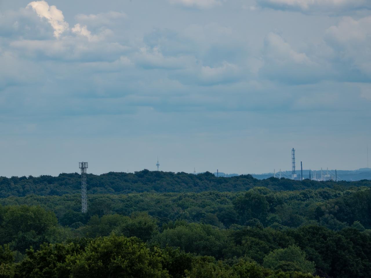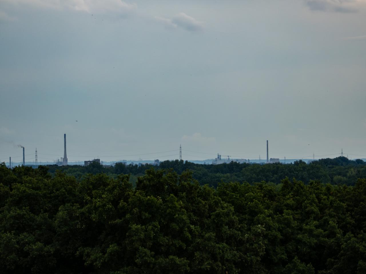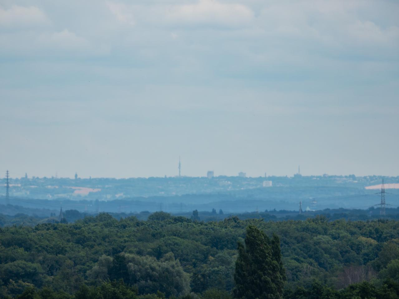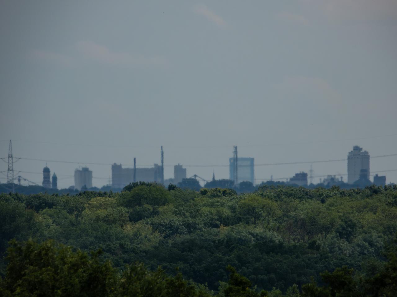 Die Gebäude am mittigen bis rechten Horizont ist gehören zu Velbert (44Km) im Vordergrund sind die Industrieanlagen Duisburg Hochfeld(20Km) zu sehen: