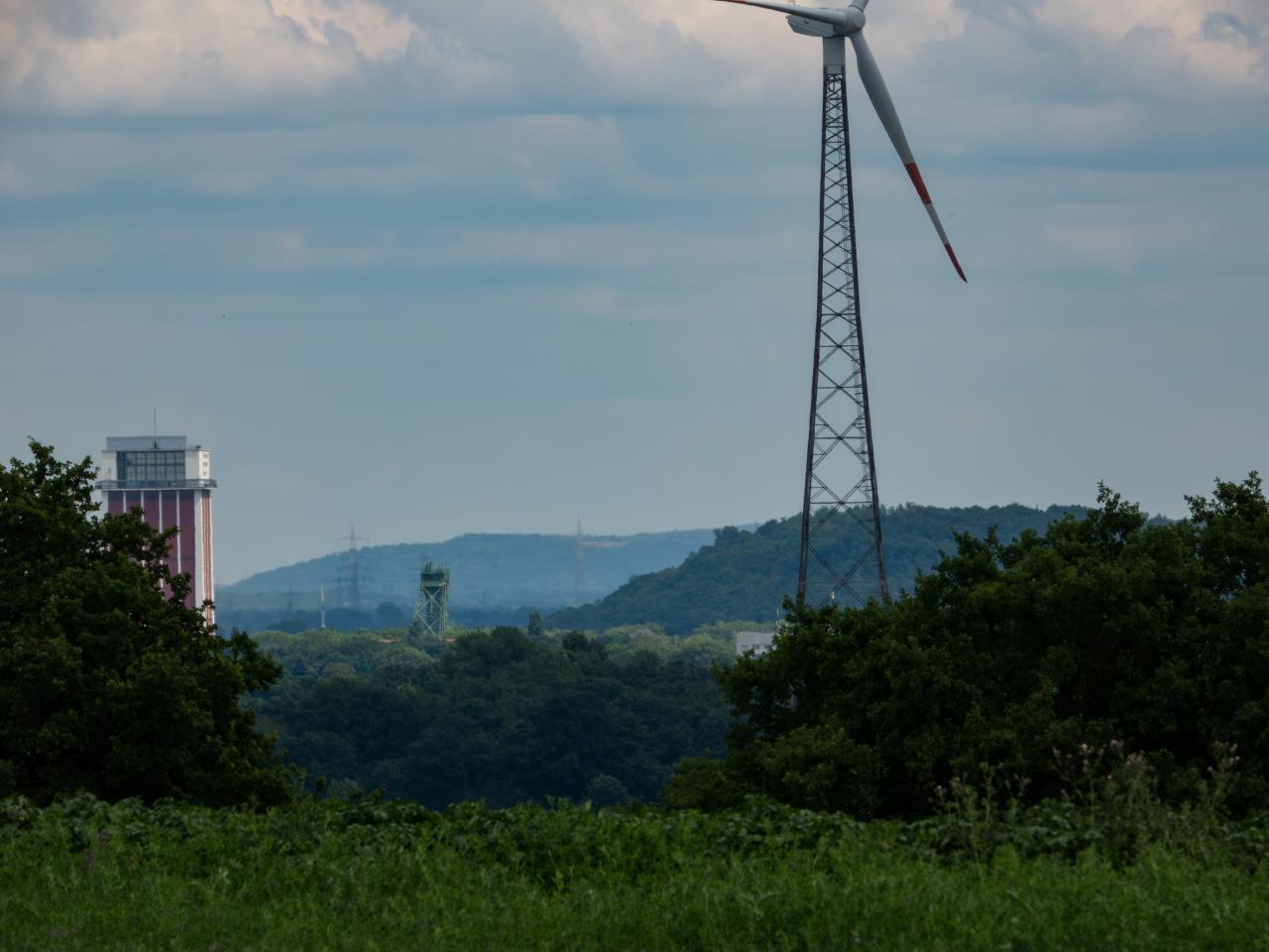 Zuerst die Halde Norddeutschland, das ist die nächste markante Landmarke (7km). Im Hintergrund links ist der Fernmeldeturm Moers zu sehen:
